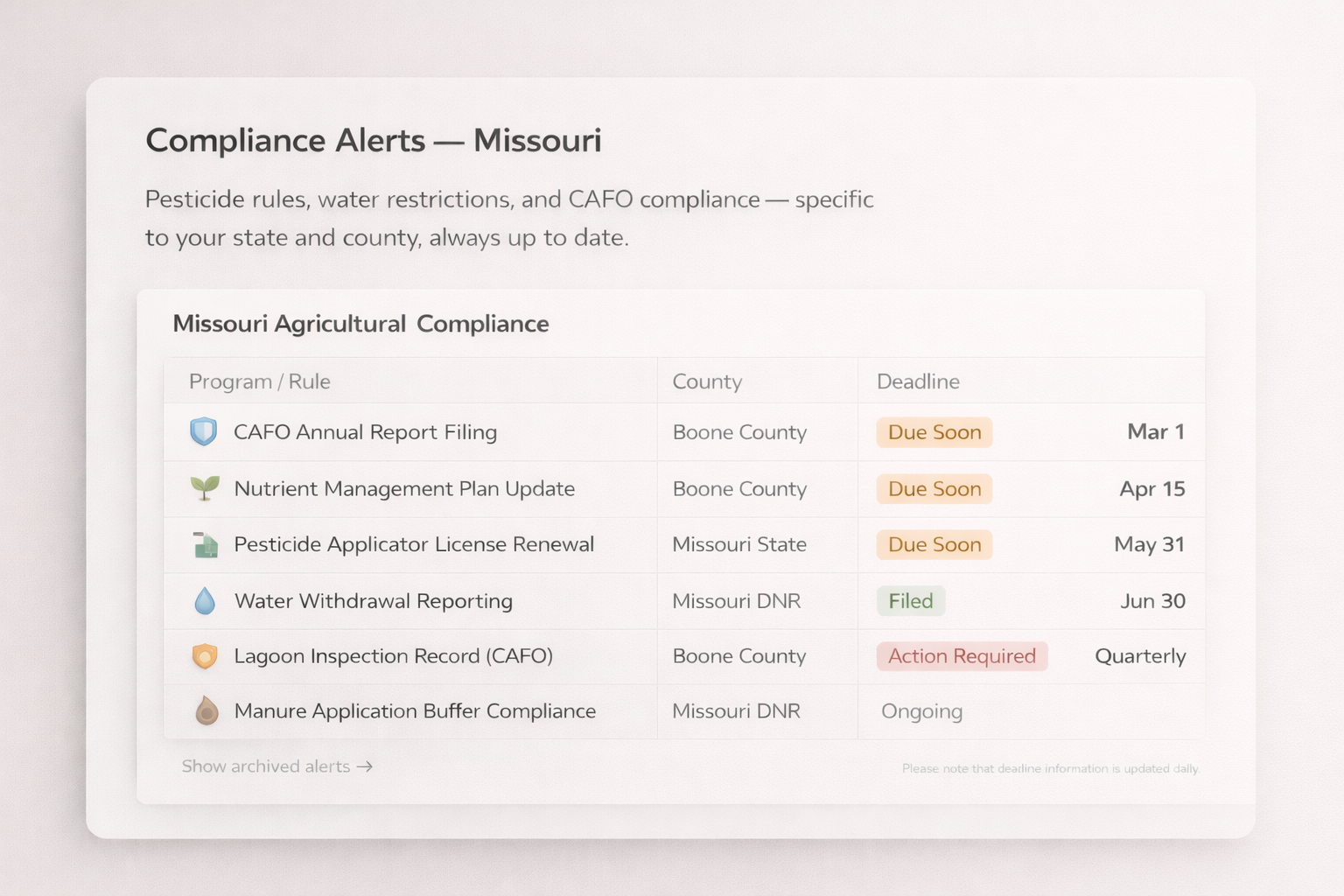Pesticide rules, water restrictions, and CAFO compliance — specific to your state and county, always up to date.